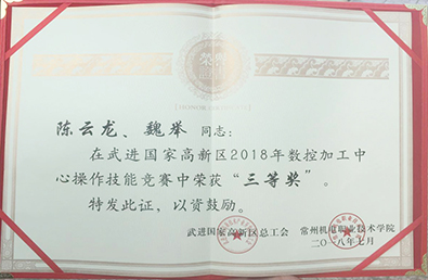 我司加工車(chē)間主任陳云龍和班長(zhǎng)魏舉果然不負(fù)眾望,榮獲三等獎(jiǎng),并由常州機(jī)電職業(yè)技術(shù)學(xué)院的馬院長(zhǎng)親自頒發(fā)證書(shū)。同時(shí)也為江蘇超聚/江蘇君華特種工程塑料制品有限公司贏得了這份榮譽(yù)。